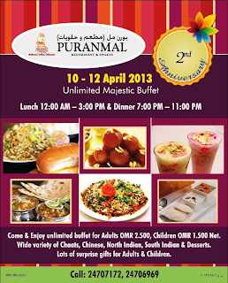 Puranmal, a vegetarian Indian restaurant down in Ruwi are celebrating their 2nd anniversary this weekend by offering a pretty sweet (pun intended!) deal on their lunch and dinner buffets: